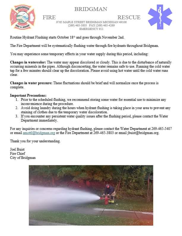 Routine Hydrant Flushing starts October 18th and goes through November 2nd
